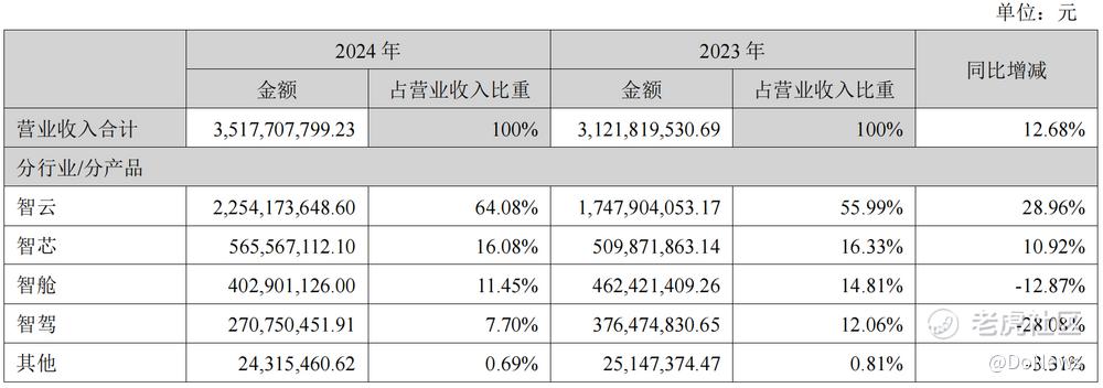 2024年,智云业务收入为22.54亿元,同比增长28.96%,是五大业务板块中同比增速最高的业务板块,同时该业务收入占总营收的比例由2023年的55.99%进一步提升至64.08%。