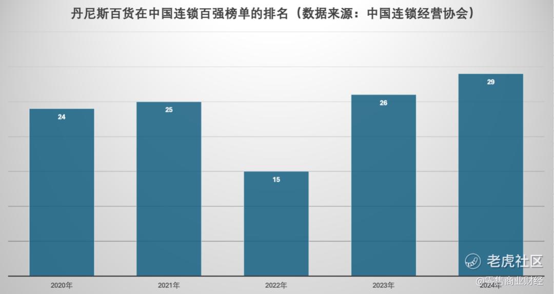 根据近五年中国连锁百强榜单显示,丹尼斯百货去年第29位的排名,已经是2020-2024年期间排名最低的一年;262.6亿元的总销售额,相较2023年还同比下滑约2%。