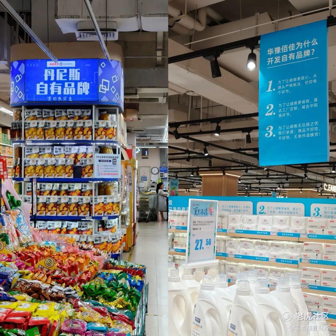 另一个细节是,如今商超零售业态都非常重视打造自营品牌,类似华豫佰佳超市会不断使用广告牌、海报来强化其自营品牌的理念,但在丹尼斯百货店内琳琅满目的商品货架中,其自营商品展示区却显得“形单影只”,而写有商品开发理念的招牌只有靠近后才能看清。