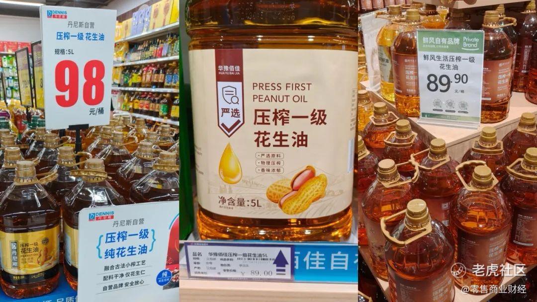比如,丹尼斯自营的5L压榨一级花生油,售价98元;华豫佰佳的同规格同种类商品售价89元、鲜风生活为89.9元、淘小胖为79.9元。