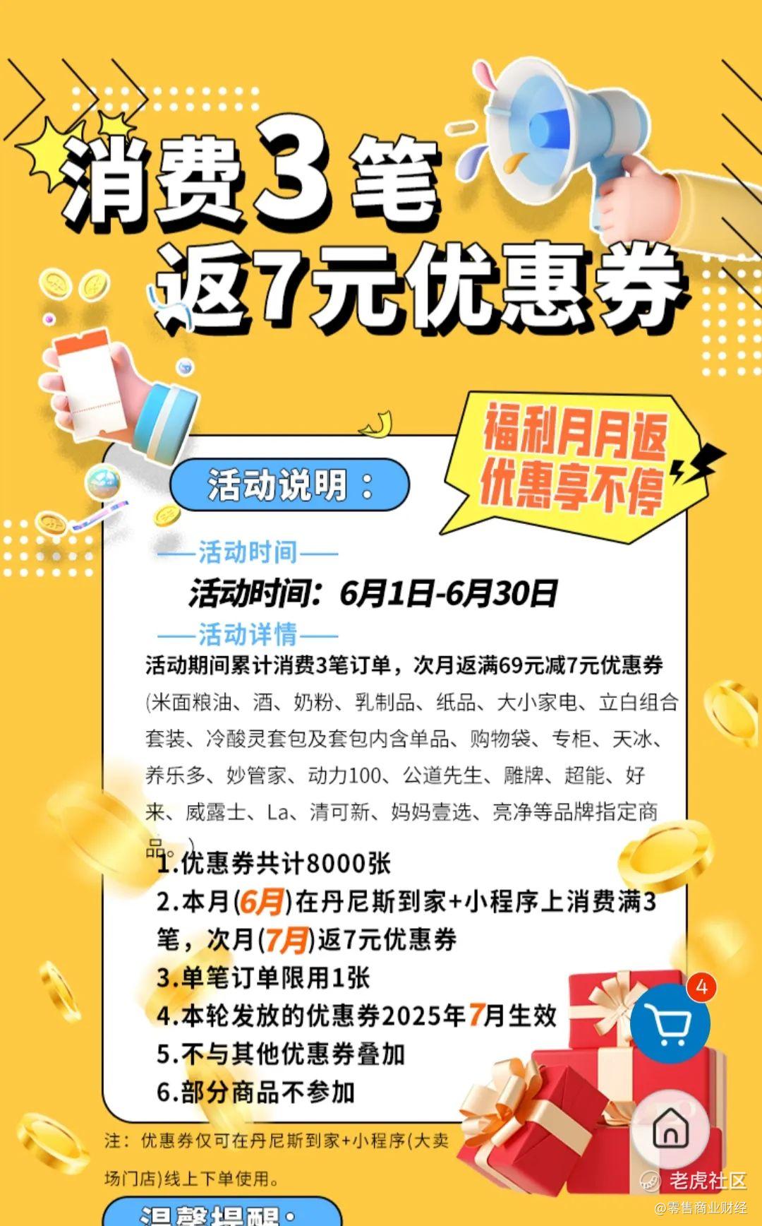 此外,丹尼斯百货还在发力推广到家配送服务,其官方微信小程序“丹尼斯到家”在6月还推出限时优惠活动:当月在小程序消费满3笔,7月将奖励一张“满69元减7元”的优惠券。