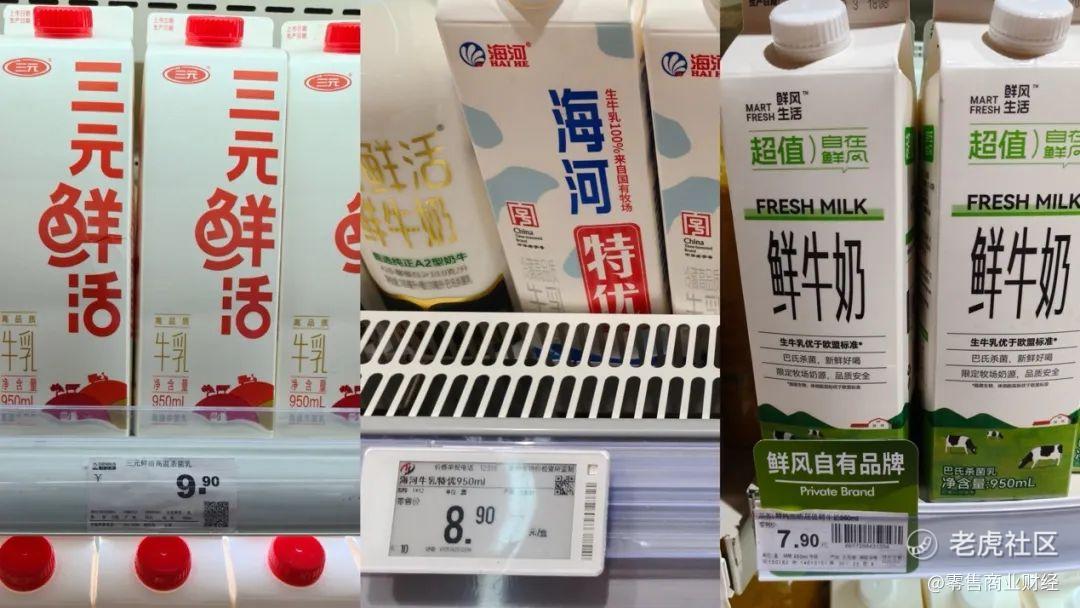 比如丹尼斯百货的牛奶货架上,单价最低的鲜牛奶为河北老牌乳制品三元鲜活,950ml售价9.9元;同比华豫佰佳的鲜牛奶选品,单价最低的为海河特优鲜牛奶,950ml售价8.9元;而鲜风生活的自营超值系列鲜牛奶,950ml售价仅有7.9元。