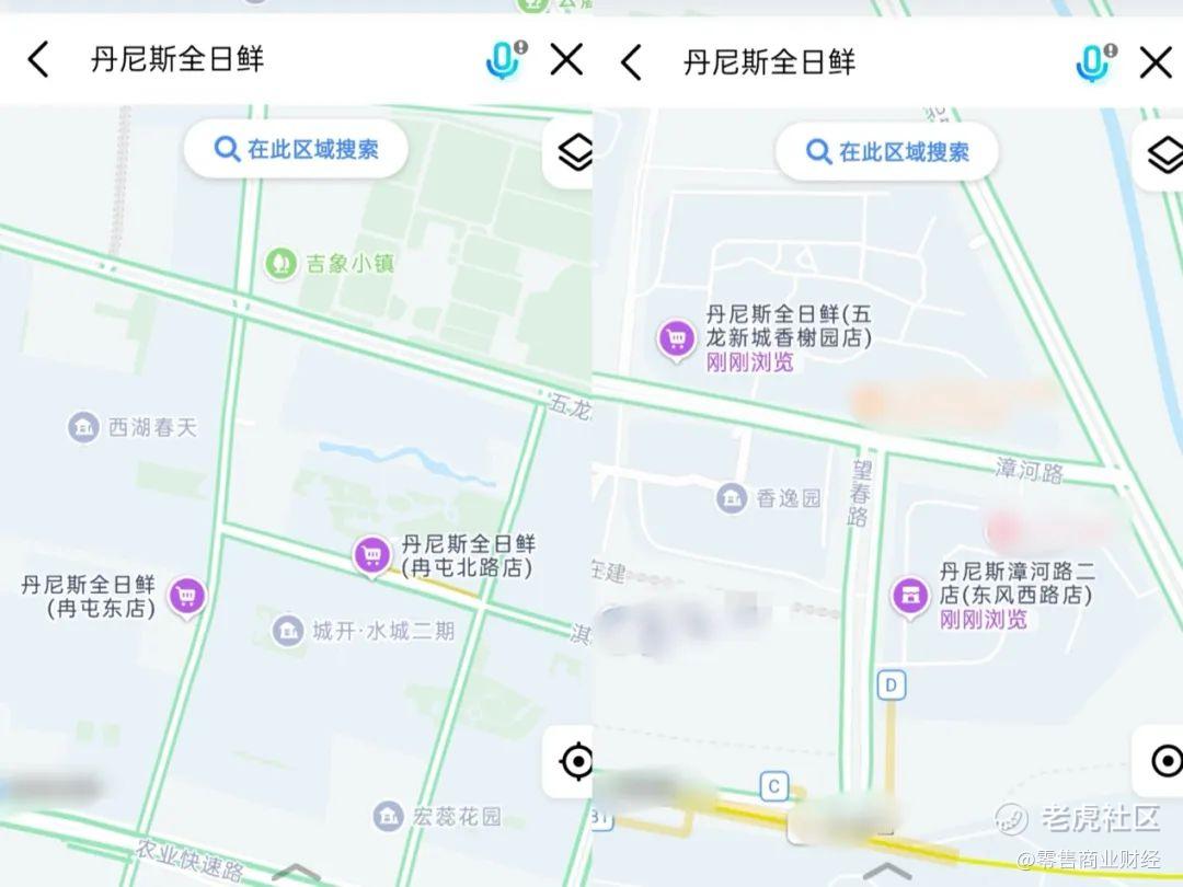 以郑州中原区某一地区为例,两家丹尼斯全日鲜门店仅相隔一个路口,更有两家门店几乎是开在一处小区的东、北两个方向,直线距离仅有百米左右。