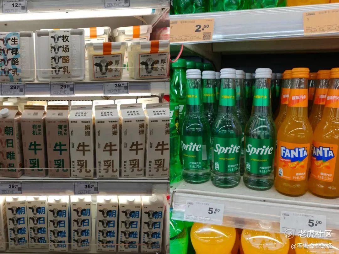 笔者在拜特超市内探访时,就发现了上海中产超市常见的、中日合资品牌“朝日唯品”牛奶,其娟珊牛乳系列950ml售价36.8元;在丹尼斯百货门店还有玻璃瓶装的275ml雪碧,售价5.8元,与华豫佰佳的同款商品价格一致。