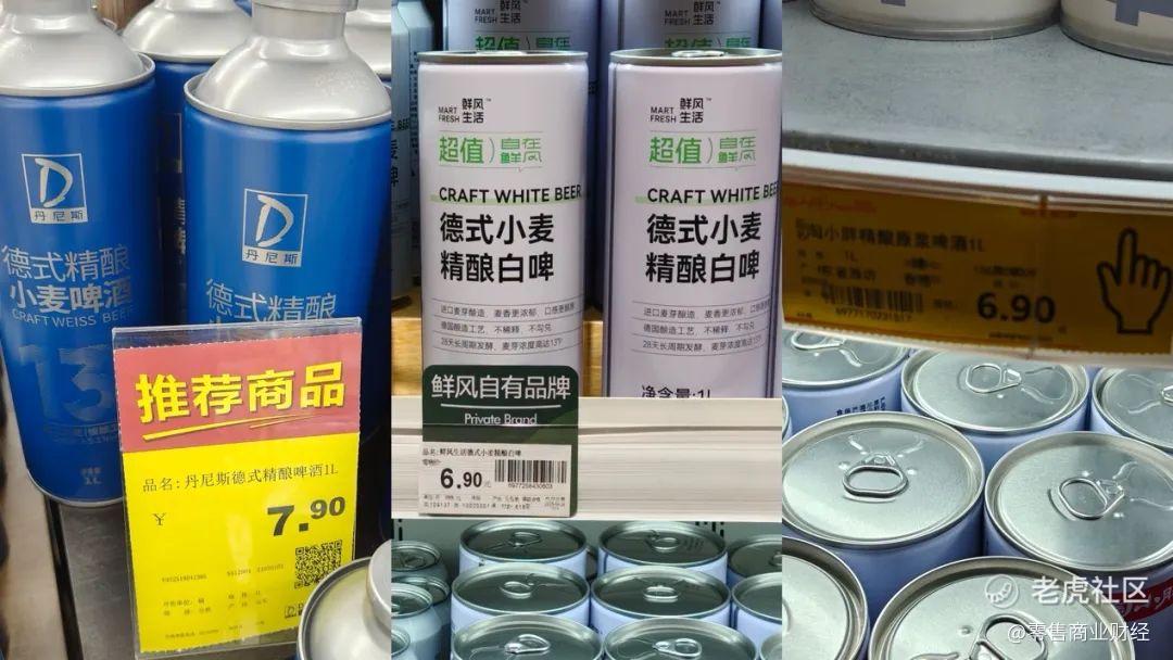 还有,丹尼斯自营的德式精酿小麦啤酒1L售价7.9元,供应商为山东绿洲啤酒有限公司,同为淘小胖1L精酿白啤酒和原浆啤酒的供应商,但淘小胖的定价为6.9元;另外,鲜风生活超值系列德式小麦精酿白啤的1L售价也为6.9元。