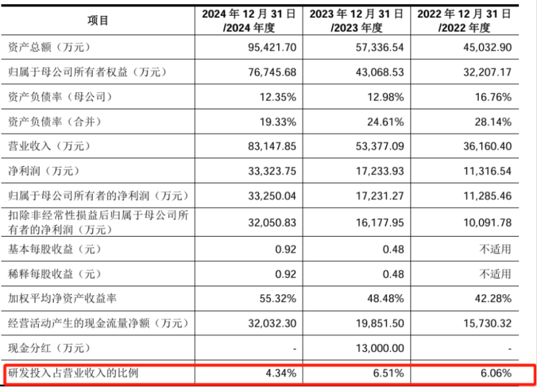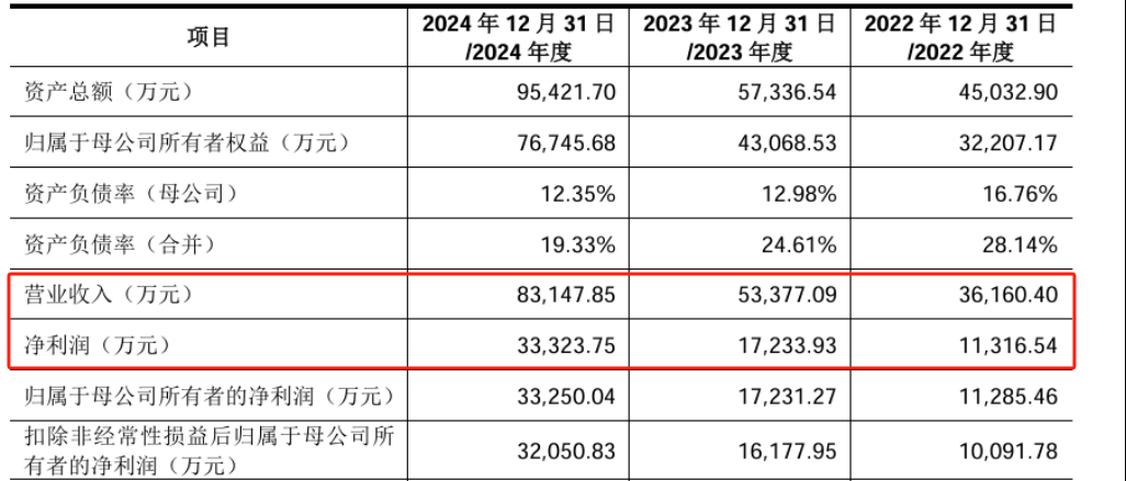2022年、2023年、2024年,公司实现营业收入分别为3.62亿元、5.34亿元、8.31亿元,同期扣非净利润分别为1.01亿元、1.62亿元、3.21亿元,营收净利双双增长。