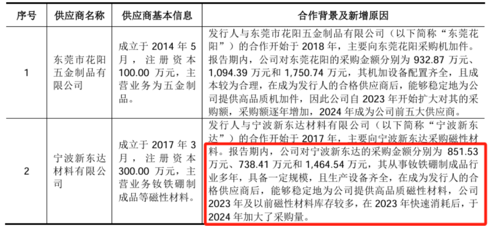 除业务结构单一化与研发投入不足外,三瑞智能的供应链体系中存在多个合作风险点。以宁波新东达材料有限公司为例,该公司成立于2017年,注册资本仅300万元,但成立当年即成为三瑞智能的磁性材料供应商,并在2024年以1464.54万元的采购额位列第四大供应商。尽管三瑞智能称其具备“稳定供应能力”,但新东达的采购金额在2022—2023年出现显著波动(851.53万元→738.41万元→1464.54万元),结合其微小资本规模,市场对其产能与质量稳定性存疑。