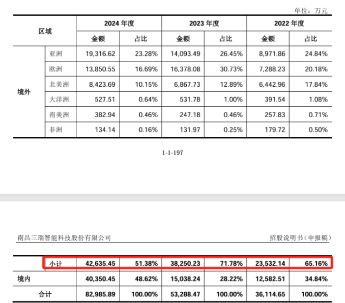 除上述问题外,三瑞智能外销业务长期占比超50%,据其招股书,2022—2024年公司外销业务收入分别为23,532.14万元、38,250.23万元和42,635.45万元,占当期主营业务收入比例分别为65.16%、71.78%和51.38%。