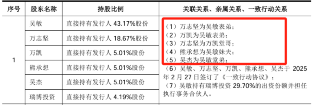 三瑞智能的股权结构呈现高度集中的家族化特征,招股书显示,实控人吴敏直接持股43.17%,并通过一致行动协议控制其亲属万志坚(表弟)、万凯(表弟)、熊承想(妹夫)、吴杰(堂弟)所持股份,合计掌控81.06%的表决权。另外,其家族成员占据核心管理岗位:表弟万志坚任董事、副总经理,妹夫熊承想、堂弟吴杰等均持股超5%并参与决策,形成“家族管理闭环”,此举虽然有利于公司战略的快速执行,但可能会导致董事会和股东会制衡机制失效,中小股东权益保障存疑。2025年2月签署的《一致行动协议》中明确规定“意见不统一时以吴敏意见为准”,进一步削弱了内部制衡机制。