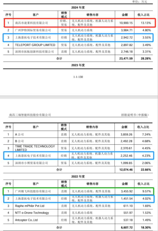 在其客户上,报告期内(2022—2024年),三瑞智能的前五大客户频繁更迭,客户结构存在极强分散性。2022年第一大客户极飞科技(收入占比9.57%)在后续年度退出主要客户名单,2024年前五大客户中仅上海悬拓电子连续三年上榜,其余客户多为新增贸易商。