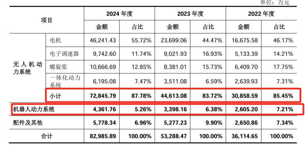 从产品来看,公司第一大产品为无人机电动动力系统,收入从2022年的3.09亿元增长至2024年7.28亿元,占主营业务收入的比例在85%左右。