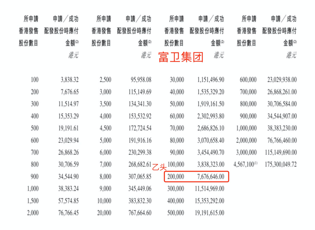 参考海天味业打新乙组需要73万本金,有2.3万申购,而打新富卫集团需要77万本金,只要热度起来,至少会有1.5万人申购,那么乙头中签10~15手。
