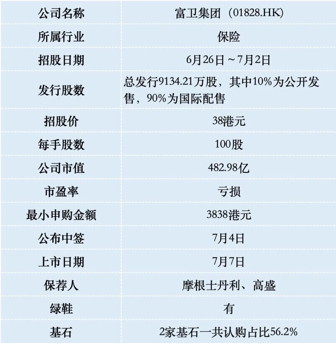 富卫集团本次IPO发行股份占全部股份比例的7.19%,按招股价38港元算,募资约34.71亿港元,2名基石投资者锁定19.5亿,流通盘15.2亿,占比总市值的3%,这个流通盘不算大。