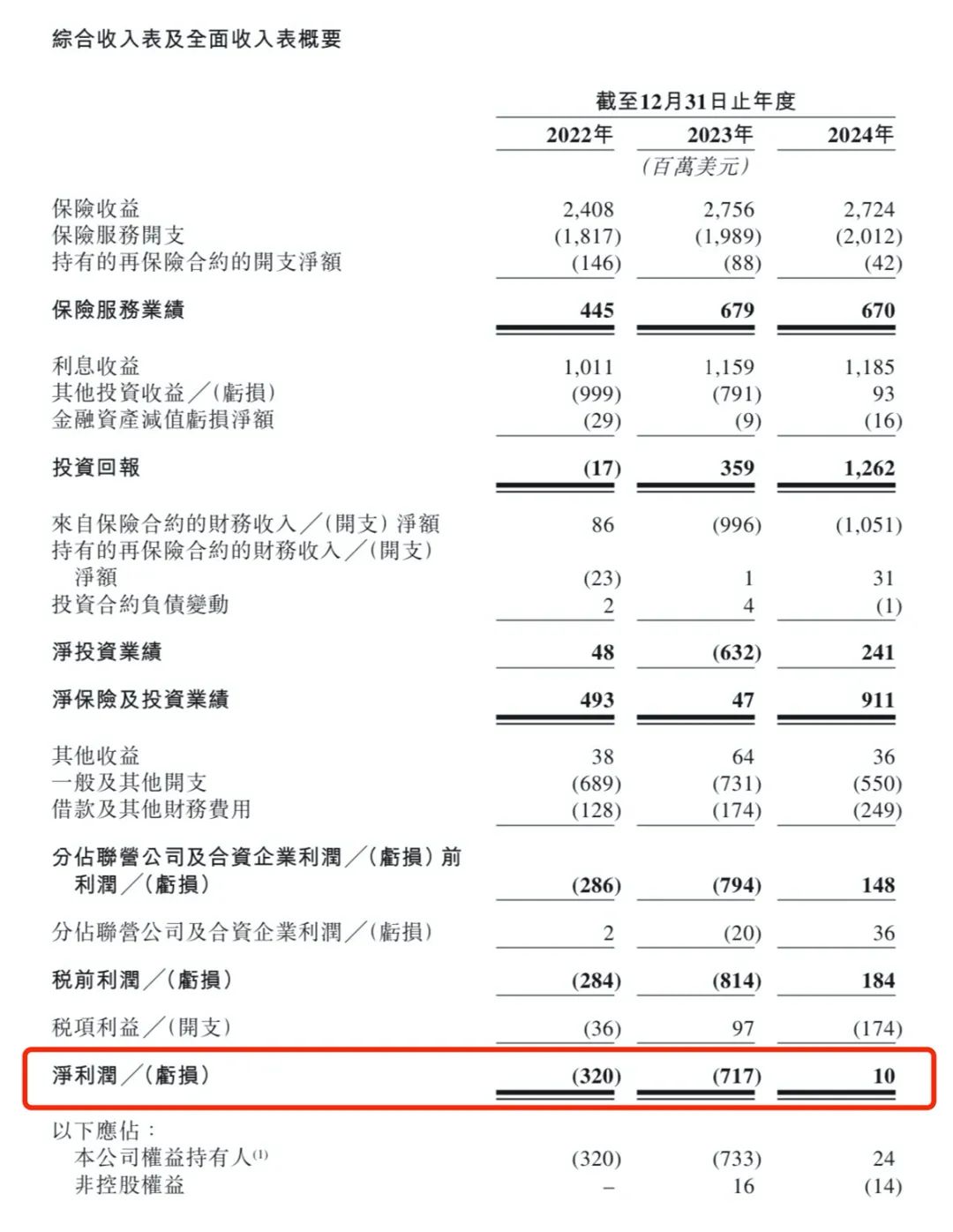 财务数据显示:2022年~2024年三个财政年度,富卫集团的净利润分别为-3.20亿、-7.17亿和1000万美元。
