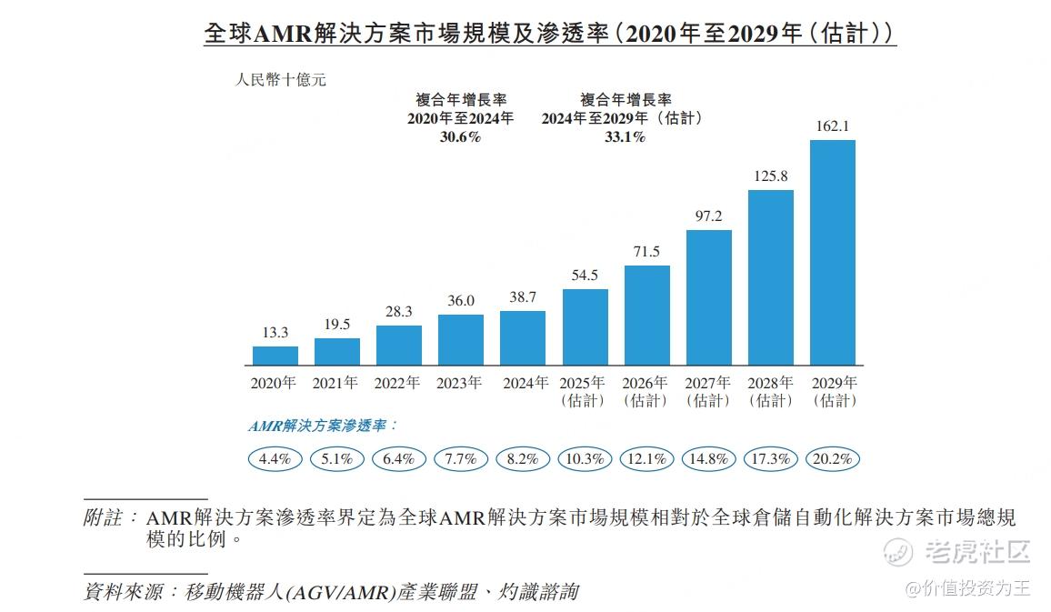 因此,根据灼识咨询的数据,全球AMR解决方案市场预计于2029年增长至人民币1,621亿元,2024年至2029年的复合年增长率为33.1%。AMR解决方案在整体仓储自动化领域的渗透率由2020年的4.4%上升至2024年的8.2%,预计2029年将达到20.2%: