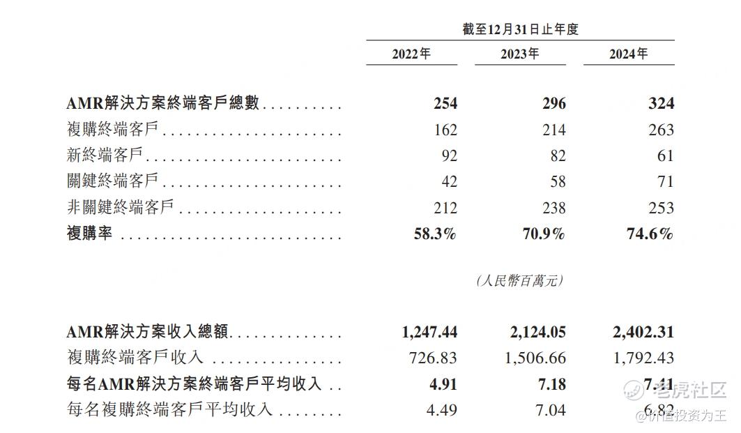 从运营数据上看,极智嘉的客户数从2022年的254家增长至去年的324家,复购率从58.3%提升至74.6%,每名客户贡献的收入从491万提升至741万: