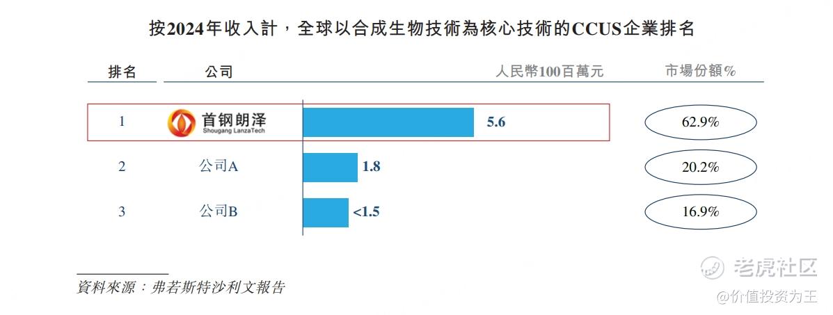 首钢朗泽是CCUS行业中首家利用经过验证的合成生物技术实现低碳产品生产商业化及规模化的公司,按2024年收入算,公司是全球最大的以生物合成技术为核心的CCUS企业: