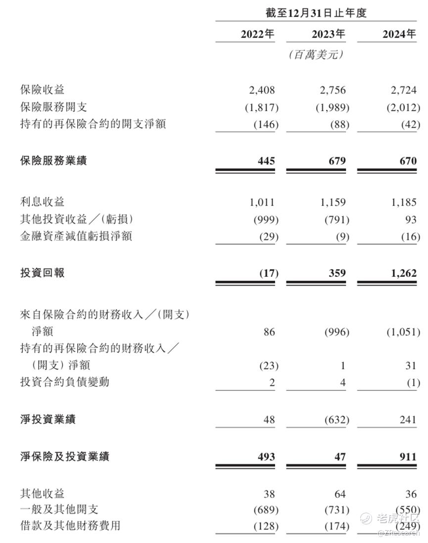 财务情况:2022年至2024年,富卫集团的净保险及投资业绩分别为4.93亿美元、0.47亿美元、9.11亿美元,复合年增长率达到35.9%。其中保险服务业绩分别为4.45亿美元、6.79亿美元、6.7亿美元,净投资业绩分别为0.48亿美元、-6.32亿美元、2.41亿美元。