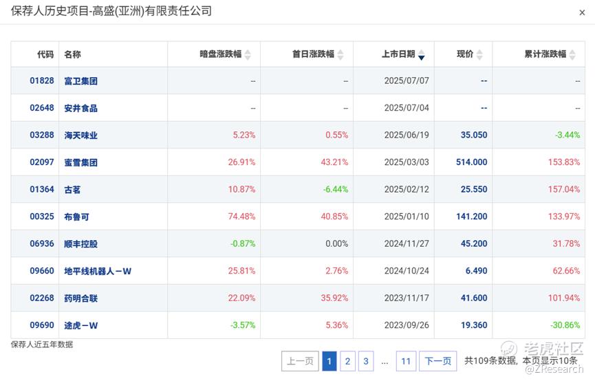 高盛历史上作为保荐人参与了107个项目,其中暗盘有47家公司上涨,34家公司下跌,26家公司平盘,破发率31.78%,首日破发率35.51%,总体胜率还行。近一年来仅参与保荐了6个项目,其中只有1家首日录得跌幅,有5家公司累计涨幅为正,近期表现突出。此外高盛参加的项目本身素质也较好,多是当期打新的热门股,累计涨跌幅也几乎都为正,后续表现值得期待。