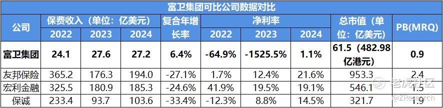 考虑2024年富卫集团68.14亿美元净资产和本次发行482.98亿港元估值,按今日汇率估算公司市值约为61.5亿美元,计算得出公司PB约为0.9x,小于1倍,并且显著低于同业可比公司的平均值,说明公司目前股票市场价低于其账面价值,被低估了,估值较为便宜。