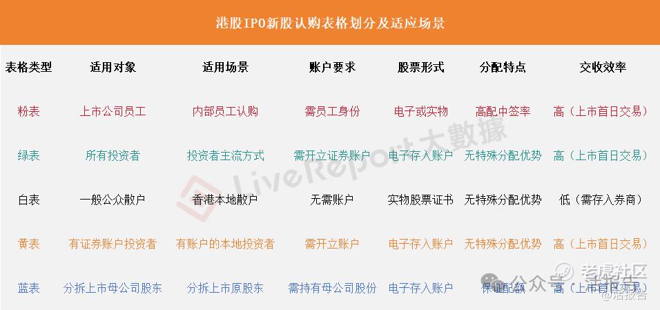 香港新股申购除了“粉表”外,还有绿表(电子认购、EIPO)、白表、黄表、蓝表,对应的投资者及适用场景也各有不同。