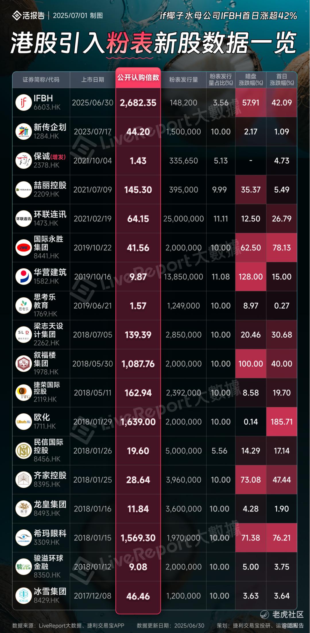 据LiveReport大数据,最近刚上市的新股IFBH(6603.HK)久违地提供了“粉表”申购,并在上市首日拥有不错的市场表现(首日涨超42%)。这引起部分老打新人的讨论,甚至喊出“有粉表的公司,就可以无脑打新”的口号。