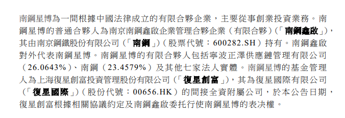 南钢星博为复星国际(00656.HK)旗下从事创业投资业务的基金,该基金的合伙人包括宁波正泽供应链管理(26.0643%)、南京钢铁股份(23.4579%)及其他8家法人实体。