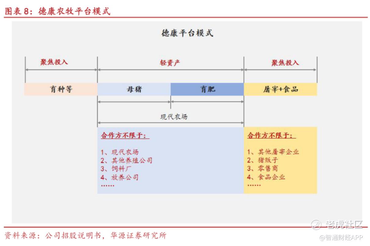 该机构指出,德康的平台模式是:“聚焦投入、技术驱动”的两端(育种+食品)+“轻资产、赋能型、平台模式”的中间养殖环节。该“平台+生态”战略引领三大变革:行业变革(政策深刻转变,资本衰退中寻找“解决方案”型企业)、模式变革(“平台+生态”模式或将成为行业转型依附对象)、公司变革(德康已由生产型企业转型为服务型企业)。德康通过服务的方式,有望创造出更大的总“蛋糕”从中收取合适的服务费。