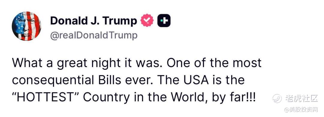 接下来,就是7月4日,美国独立日,特朗普签署成真正法案,这既是向美国国庆献礼,更是展现特朗普的重大胜利。所以,焦虑了很多天的特朗普,现在也是龙颜大悦,赞美说:就因为这个法案,美国变得地球上最性感了。