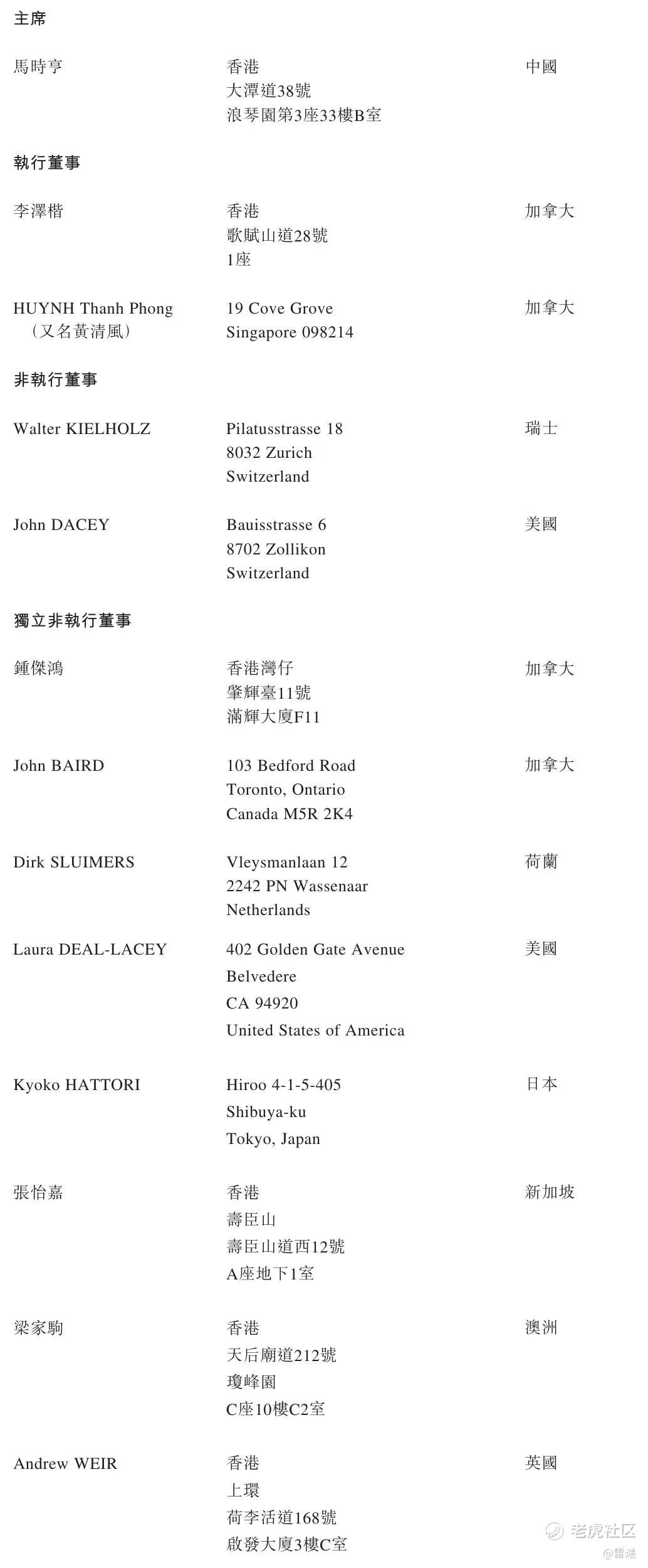 其中,李泽楷、HUYNH Thanh Phong(又名黄清风)、锺杰鸿、John BAIRD为加拿大籍,Walter KIELHOLZ为瑞士籍,John DACEY、Laura DEAL-LACEY为美国籍,Dirk SLUIMERS为荷兰籍,张怡嘉为新加坡籍,梁家驹为澳洲籍,Kyoko HATTORI为日本籍,Andrew WEIR为英国籍。