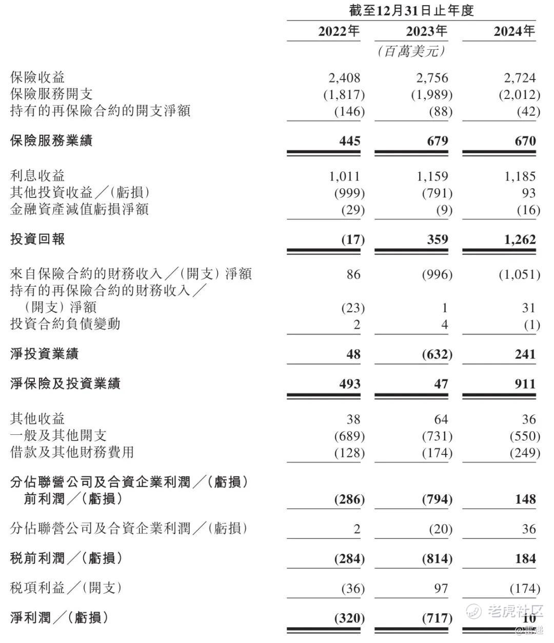 富卫保险2022年、2023年、2024年净保险及投资业绩分别为4.93亿美元、4700万美元、9.11亿美元;净利润分别为-3.2亿美元、-7.17亿美元、1000万美元。