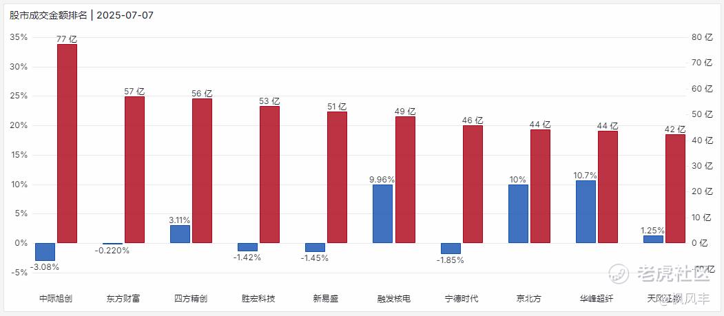 1、成交额前三:$中际旭创(300308)$、$东方财富(300059)$、$四方精创(300468)$