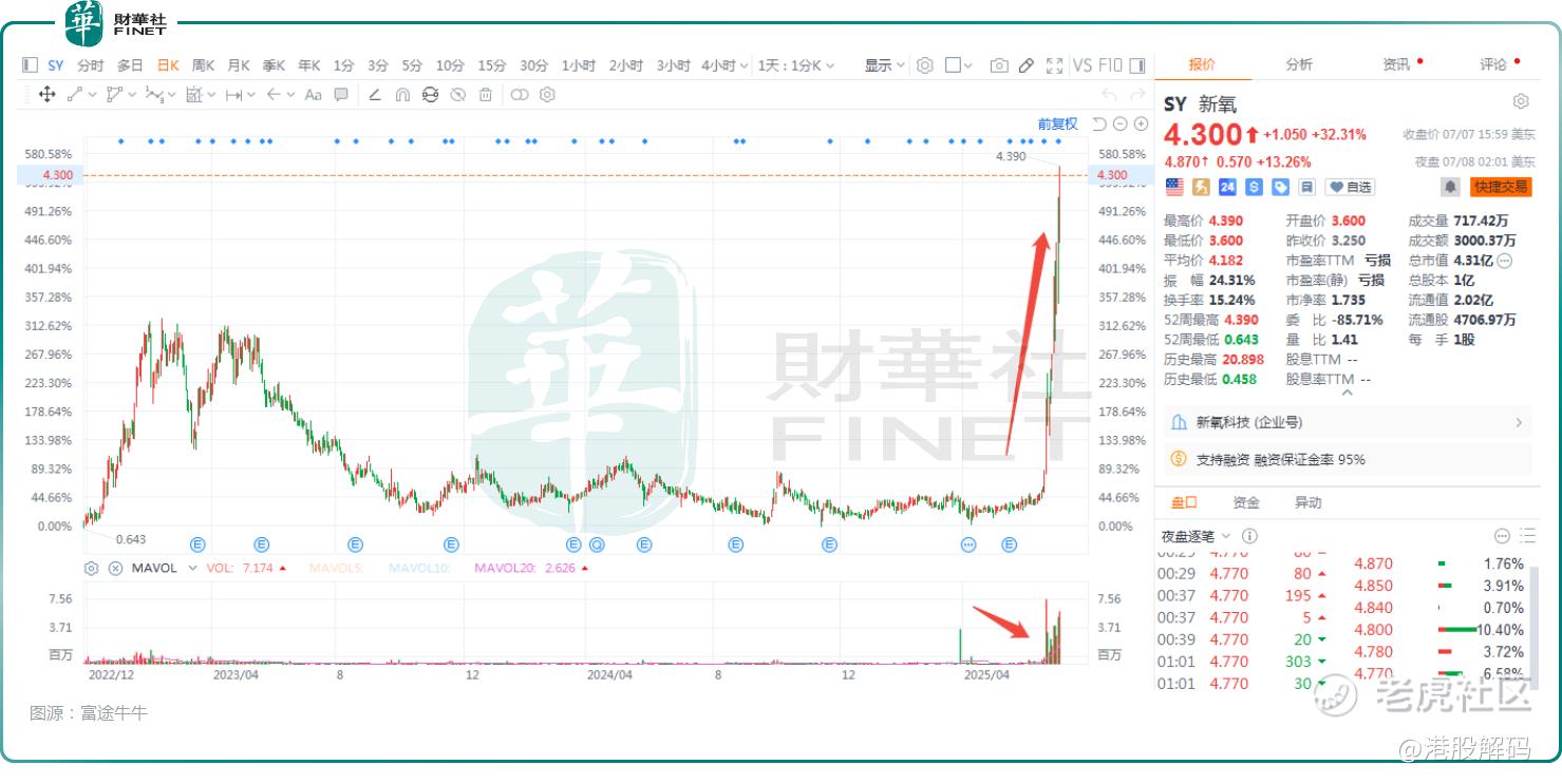 7月7日(当地时间), $云米科技(VIOT)$ 、 $新氧(SY)$ 、 $雷亚电子(RAYA)$ 等多只中概股迎来大涨。其中,新氧放量飙升了32.31%,而如果从6月20日算起至今其股价更是累涨近326%,走势异常强劲。