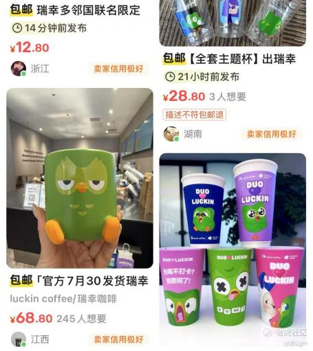 参照以往与茅台联名“酱香拿铁”时推出纸袋、与“黑神话”联名时推出光栅卡和限定海报引发的抢购热潮,此次瑞幸与多邻国的联名周边,不出意外地,又一次成为黄牛的完美标的。