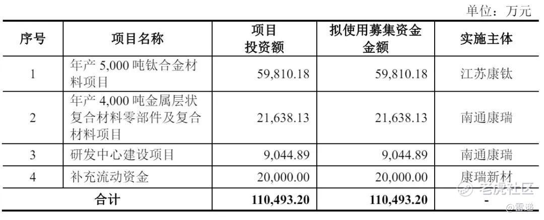 康瑞新材计划募资11亿元,其中,5.98亿元用于年产5000吨钛合金材料项目,2.16亿元用于年产4000吨金属层状复合材料零部件及复合材料项目,9045万元用于研发中心建设项目,2亿元用于补充流动资金。