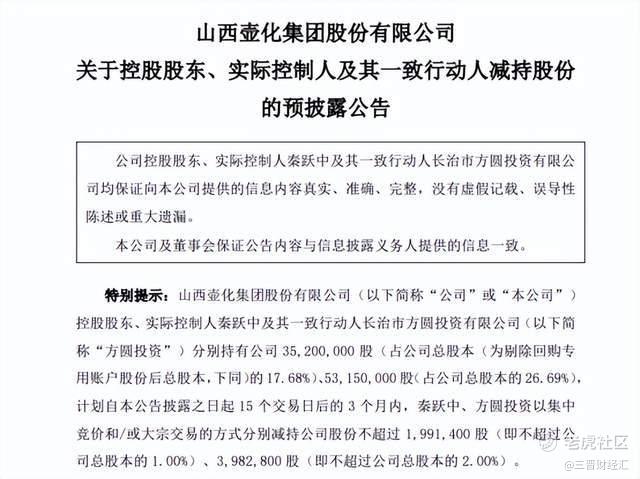 7月6日晚间,民爆行业上市公司壶化股份(山西壶化集团股份有限公司,003002.SZ)发布公告,公司实际控制人秦跃中及其一致行动人长治市方圆投资有限公司(以下简称“方圆投资”)双双抛出减持计划。