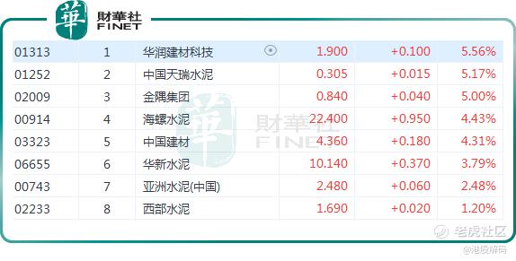 7月10日,水泥建材股延续强势表现。 $华润建材科技(01313)$ 涨5.56%, $中国天瑞水泥(01252)$ 涨5.17%, $海螺水泥(00914)$ 涨4.43%, $中国建材(03323)$ 涨4.31%, $华新水泥(06655)$ 涨3.79%。