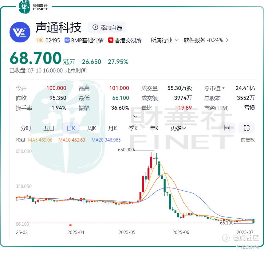 7月10日,港股的 $声通科技(02495)$ 暴跌27.95%,创上市以来新低,目前公司报68.7港元/股,市值24.41亿港元。更令人咂舌的是,今日公司成交金额接近4000万港元,出现明显的放量,投资者纷纷选择用脚投票。