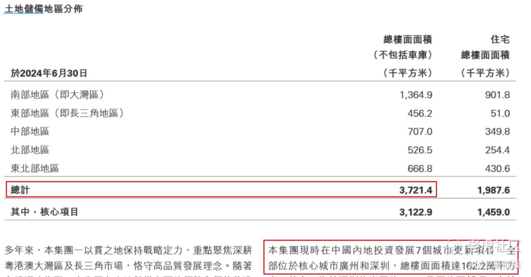 财报显示,截至2024年6月30日,其在中国内地投资7个城市更新项目,总楼面面积162.2万平方米,约占内地总土储372.14万平方米的44%。