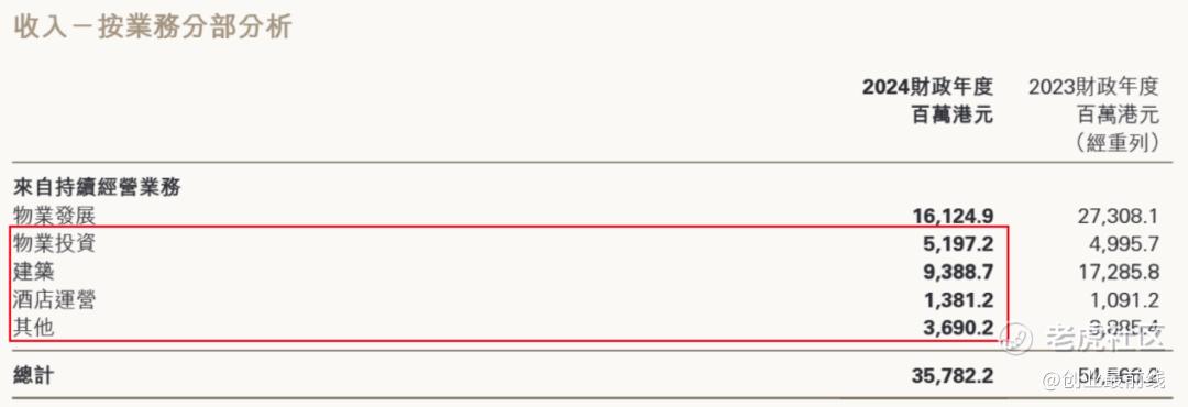 而新世界发展能够更快获得金融机构的支持,与其资产更为多元化有一定关系。相比于更专注于住宅开发的恒大、碧桂园等房企,新世界发展的资产包相对更均衡,酒店、物业投资、建筑等业务更为成熟,这些业务在2024财年贡献的收入在13亿港元至94亿港元之间,形成更稳定的现金流。