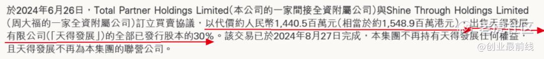 2024年6月,新世界发展间接全资附属公司Total Partner Holdings Limited将天得发展30%股权,出售予周大福的全资子公司,回笼资金人民币14.405亿元(相当于约15.49亿港元)。