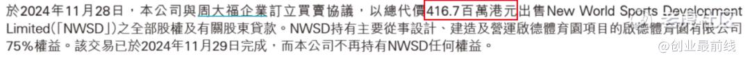 2个月后(11月),公司又将启德体育园项目75%股权转让予周大福企业,总代价4.167亿港元。