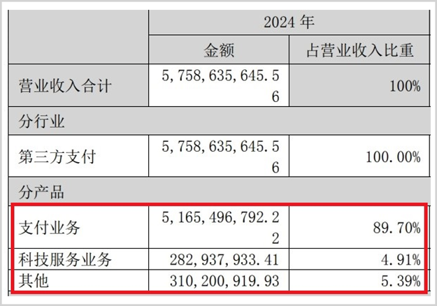 从营收结构来看,拉卡拉的业务分为支付业务、科技服务业务、其他业务三块,其中支付业务是绝对大头,2024年营收占比接近90%。