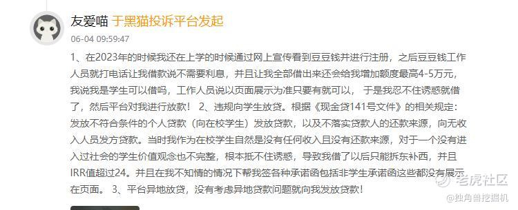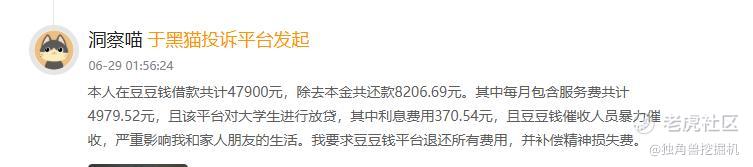 6月29日,一位借款人投诉在豆豆钱对大学生放贷,他一共借款共计47900元,除去本金共还款8206.69元,包含服务费4979元,其中利息费用370.54元。