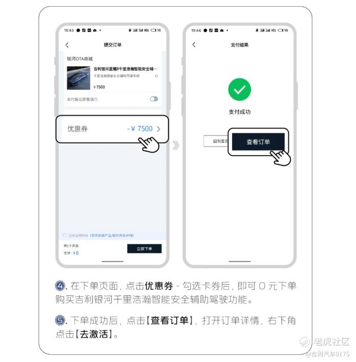 4. 在下单页面,点击优惠券-勾选卡券后,即可0元下单购买吉利银河千里浩瀚智能安全辅助驾驶功能。