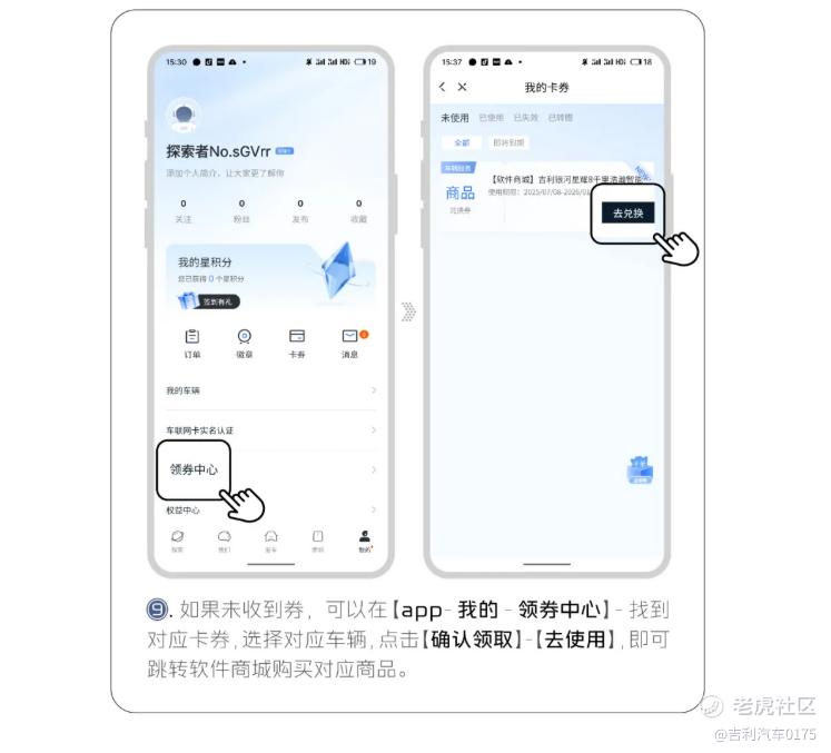 9. 如果未收到券,可以在【app-我的-领券中心】- 找到对应卡券,选择对应车辆,点击【确认领取】-【去使用】即可跳转软件商城购买对应商品。