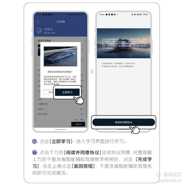 7. 点击下方的【阅读并同意协议】完成协议同意,完整观看上方的千里浩瀚智能辅助驾驶教学视频后,点击【完成学习】-在左上角点击【返回按钮】,千里浩瀚智能辅助驾驶系统即可完成激活。