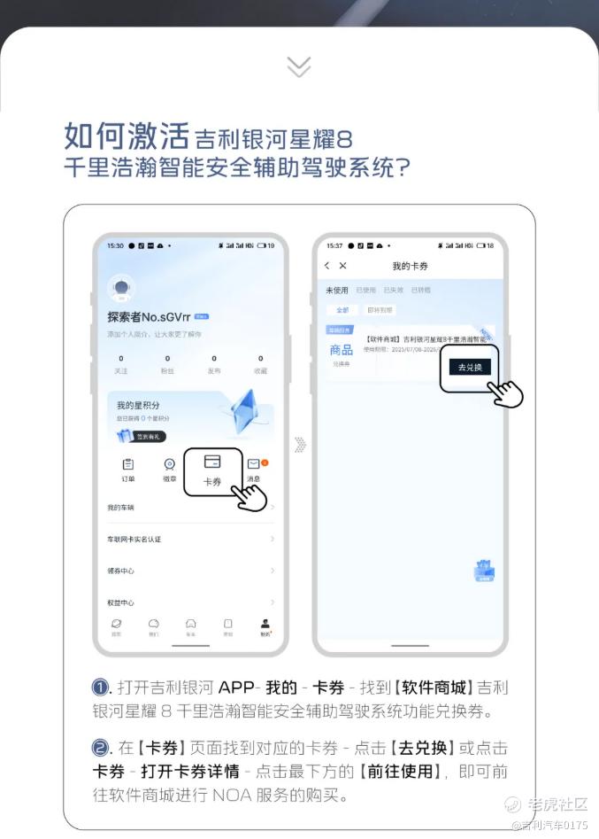 1. 打开吉利银河APP-我的-卡券-找到【软件商城】吉利银河星耀 8千里浩瀚智能安全辅助驾驶系统功能兑换券。