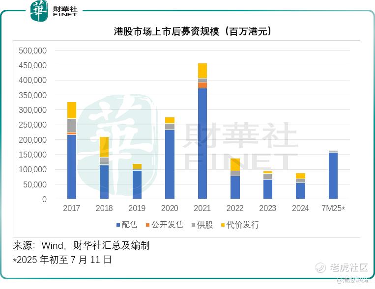 新股市场热闹非凡,上市后募资活动也愈发活跃。Wind的数据显示,2025年初至7月11日,港股市场上市后募资规模达到1,644.18亿港元,已超越IPO募资规模1,235.64亿港元。而且,仅仅半年的上市后募资规模已接近去年全年上市后募资规模的两倍,见下图。