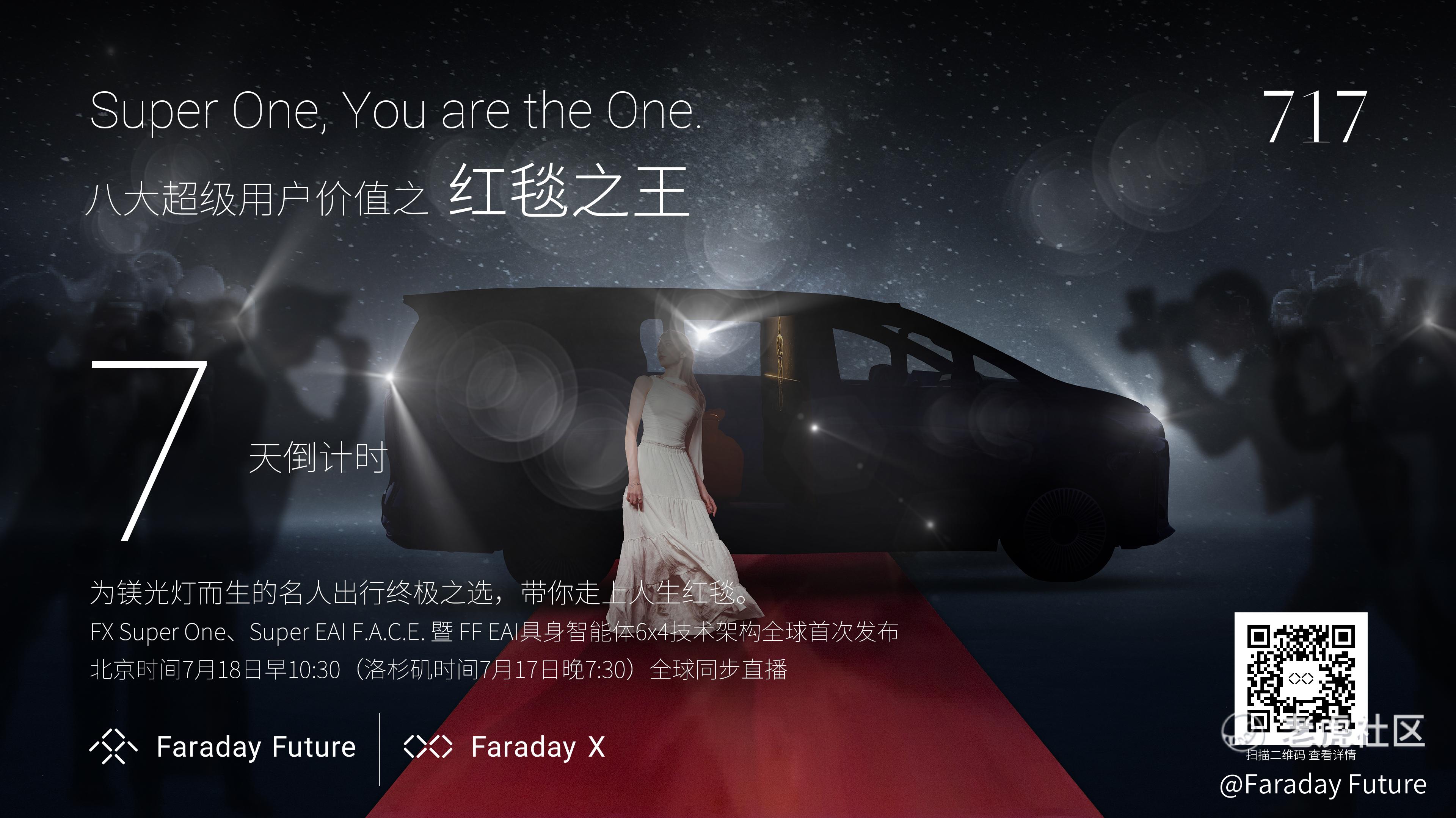 - Faraday Future·2025-07-117月17日,FF将隆重发布FX Super One,Super EAI F.A.C.E. 以及FF EAI 具身智能体 6×4技术架构。参与预订的股东在完成持股验证后,将享受专属礼遇。发布会后,所有完成预订确认的用户将收到专属优先预订链接,尊享首批车主权益与优先交付礼遇。感谢大家的支持和关注。点赞举报